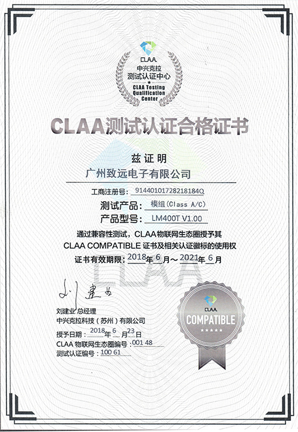 2018年6月,ZLG致遠(yuǎn)電子自主研發(fā)設(shè)計(jì)的LM400TU系列LoRa核心模組通過(guò)了中興CLAA兼容性測(cè)試,獲得CLAA COMPATIBLE證書(shū)。LM400TU可以作為ClassA/C終端接入CLAA物聯(lián)網(wǎng)生態(tài)圈。