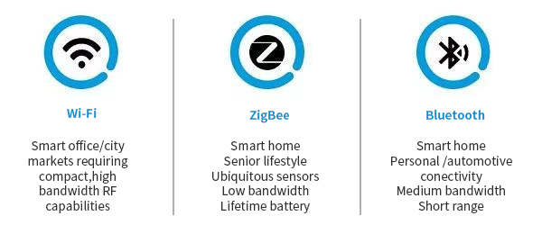 圖 2 Wi-Fi、ZigBee、Bluetooth適用場景與特點(diǎn)