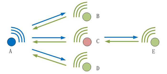 3、如圖 9所示,當主從節(jié)點的距離無法直接通訊時,只需將兩點距離中一個節(jié)點(如C點)設(shè)置成路由模式,則能完成數(shù)據(jù)轉(zhuǎn)發(fā),其他所有設(shè)置均和第2點的設(shè)置一樣。