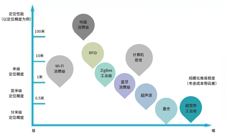 室內(nèi)定位方案有:ZigBee TOF定位、Wi-Fi定位、紅外線定位、藍(lán)牙定位、射頻識(shí)別定位、超寬帶UWB定位等,各種方案的性能以及成本情況如下圖所示。